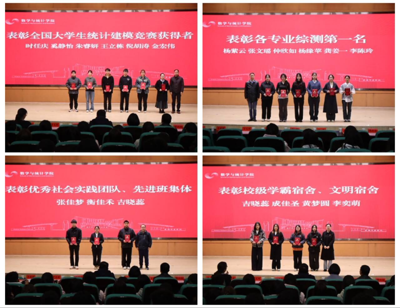 学生代表吉晓蕊、张严元分别从奋斗和安全两方面进行了交流分享,勉励大家将安全作为奋斗之基,让奋斗成为青春底色,逐浪行舟,行稳致远。会上集中表彰了国家奖学金、美德奖学金、国家励志奖学金、全国大学生数学竞赛、全国大学生统计建模大赛、优师奖学金、暑期志愿服务、学霸宿舍等先进集体和个人。