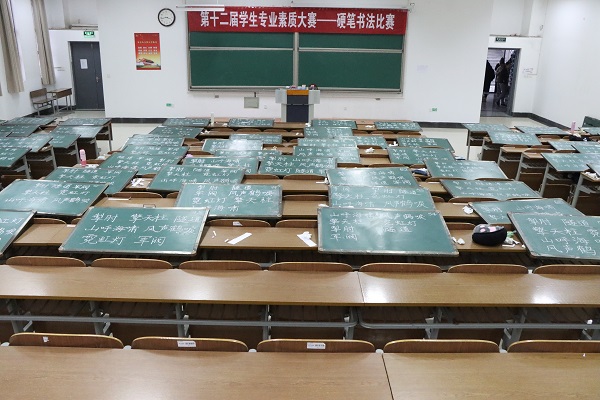 比赛开始后,参赛选手们全神贯注,认真地在小黑板上写出一笔一划,铁画银钩,各有自己的风格。粉笔字写毕,各位同学退场,马老师仔细观察同学们作品中的优劣之处,并为整体作品打分。而后的钢笔字比赛中,同学们反复体味每个字的韵味,完成了一幅幅优秀作品。比赛期间,监考老师和学生组认真巡考,现场井然有序。