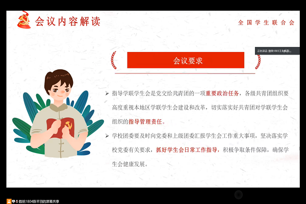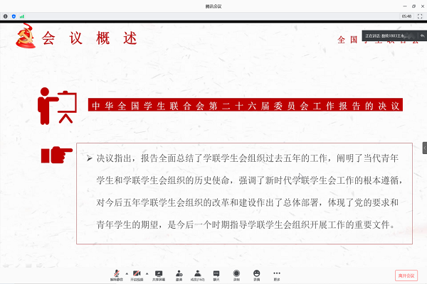 上午十一时,会议正式开始,主持人明确此次会议的目的及意义,带领与会成员共同回顾全国学联二十七大的主要内容,从会议强调、会议要求、大会号召三个方面对全国学联二十七大会议进行深入分析,传达了全国学联二十七大的基本概况、学联工作报告的主要内容。随后重点对习近平总书记贺信做出全面深刻的解读,并强调在习近平新时代中国特色社会主义思想理念指导下,团学干事应以贺信精神全心全意为学生服务。最后,主持人进行会议总结,鼓励学生干部务实奋发,用更加饱满的精神状态服务广大学生。