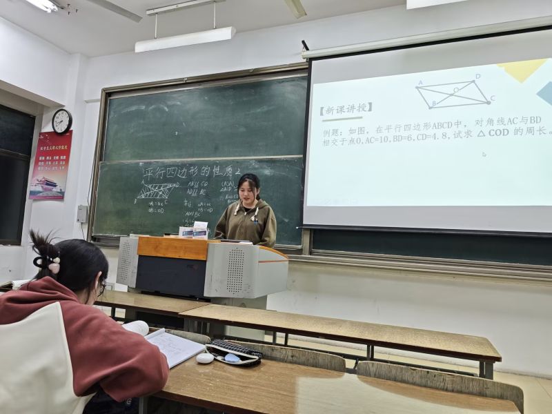 活动伊始,戴斌同学组织课堂模拟。讲授“平行四边形的性质2”,他先回顾之前知识,巩固同学们的基础,接着用老人分地的实例引入新课,快速抓住大家的注意力。课堂模拟中,面对“学生”交头接耳,戴斌同学巧妙提问,顺利化解课堂危机,展现出良好的课堂掌控能力。