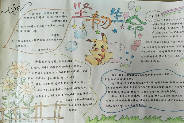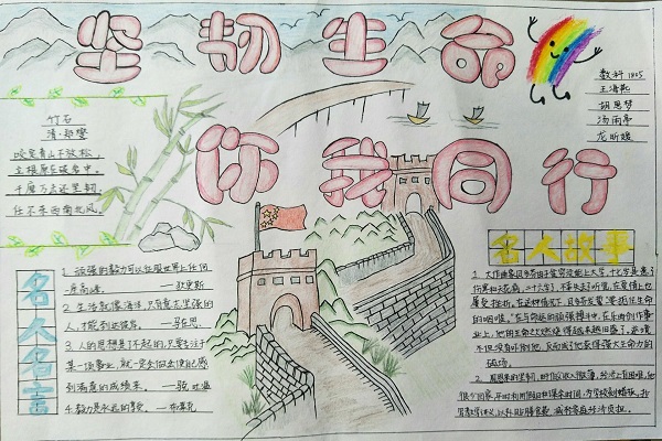 此次活动旨在让同学们在手抄报,绘画,漫画中融入对坚韧生命的理解,让其以色彩的形式简单易懂向大家展示坚韧的生命最美丽。参加活动的同学们认真的进行了绘画创作,上交的作品主题鲜明,紧扣“坚韧生命”的主题,设计新颖,构思独特,内容丰富多彩,其中包括“名人名言”,“名人故事”等。同学们用栩栩如生的画面,生动形象的文字展现了“坚韧之美,你我同行”的重要含义,人生的路上难免会有跌倒,但请你相信生命会用坚韧开出最亮眼的花朵。