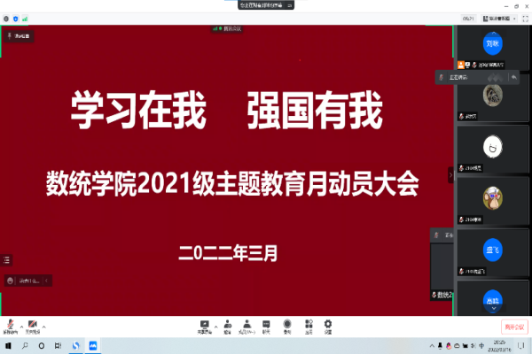 翔宇网3月19日电 记者(赵洪艺)为了增强青年学生们的爱国情怀 ,培养正确的人生价值观 ,认真贯彻落实全国教育大会、全国高校思想政治工作会议精神, 2022年3月19日星期六数统2102班开展“学习在我,强国有我”的线上主题活动 。