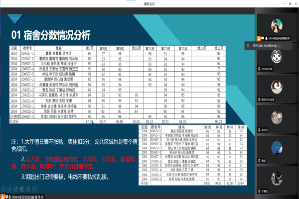 活动伊始,梁定伟同学阐明宿舍环境的重要性。接下来,梁定伟同学用几份数据,从纵向和横向分析了班级宿舍的情况。宿舍分数客观地反应了一个宿舍的打扫程度,更是环境整洁度的具象化体现。不仅如此,宿舍是同学们生活、休息乃至学习的场所,一个学期的分数走向、整个班级的分数走向都是值得关注的。活动结束,同学们对于宿舍打扫方面有了更深的体会。