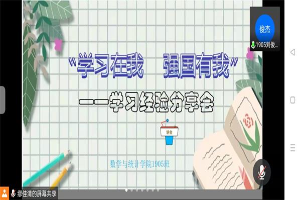 在本次活动中,邀请到了学习委员钱晨曦、吴春云、副班长邵心怡、聂志宇、程为以及刘俊杰同学给我们分享了他们的学习经验。本次活动综合运用腾讯会议、网络等各种媒体,强化学习的重要性,引导大家进行自我反思,自我规划接下来该如何度过剩下的大学时光。同学们都积极配合,活动在大家的共同努力下,取得圆满成功。