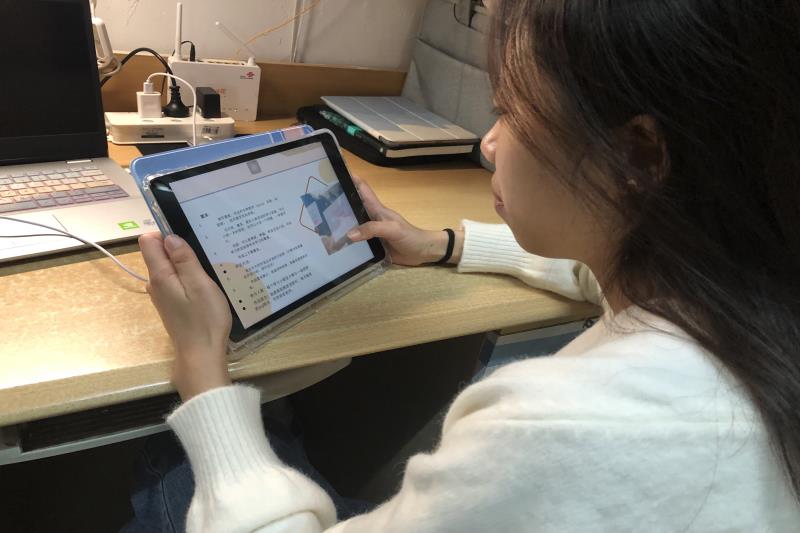 图为同学聆听视频讲解。记者 邵心怡 摄