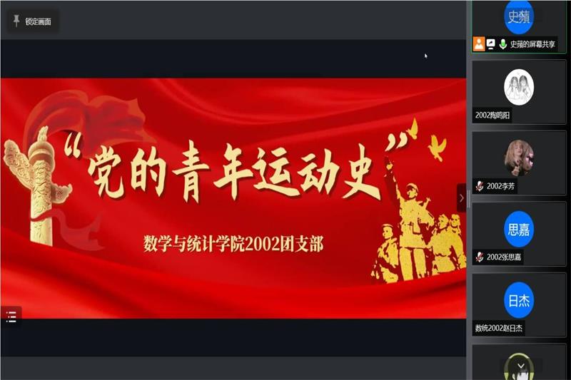 翔宇网4月16日电 记者(刘晓 睢堰)为更好地引导团员青年树立坚定的理想,帮助学生形成积极向上的生活态度和奋斗精神,新葡萄8883官网AMG2002班于4月15日线上开展了“党的青年运动史”线上主题团日活动,本次活动由团支书史蘋主持。