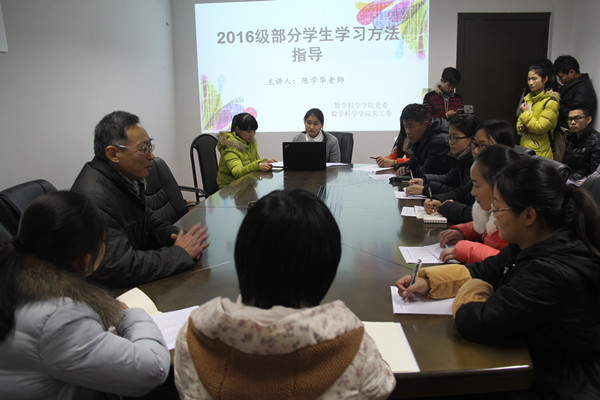 11月30日在理工北楼301,数科学院关工委举办受资助学生学习方法专题指导活动。学院党委书记、关工委主任高卫国主持本次活动,学院退休教师陈学华、负责资助的老师吴以立、2016级部分受资助的特困生新生参加本次活动。