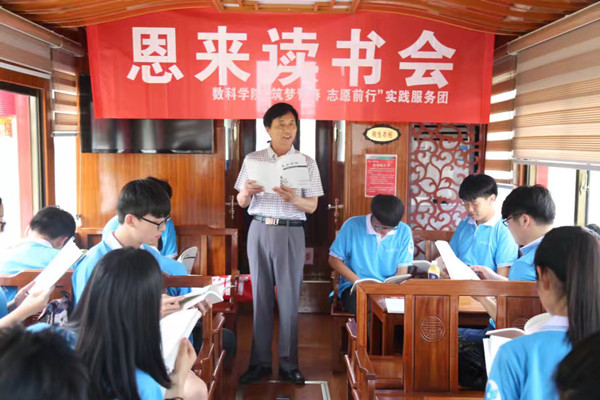 清江浦码头上,在船务人员的带领下,实践团的同学们登上了“翔宇号”画舫船。初踏进船舱,映入队员们眼帘的是红木座椅与装饰,透着古典的韵味与芳香。随着数科院党委书记、马强老师及实践团队员们入座,这艘小船慢慢的驶离渡口。在关工委马强老师激昂的朗读声中,同学们品读着《黄金时代》,一本周恩来总理的作品集。一人一船一本书,悟情悟理悟文化。在马强老师那慷慨激昂的话语中,在同学们的朗朗书声中,无不散发着对恩来精神的憧憬与向往,怀念那段属于自己的黄金时代。