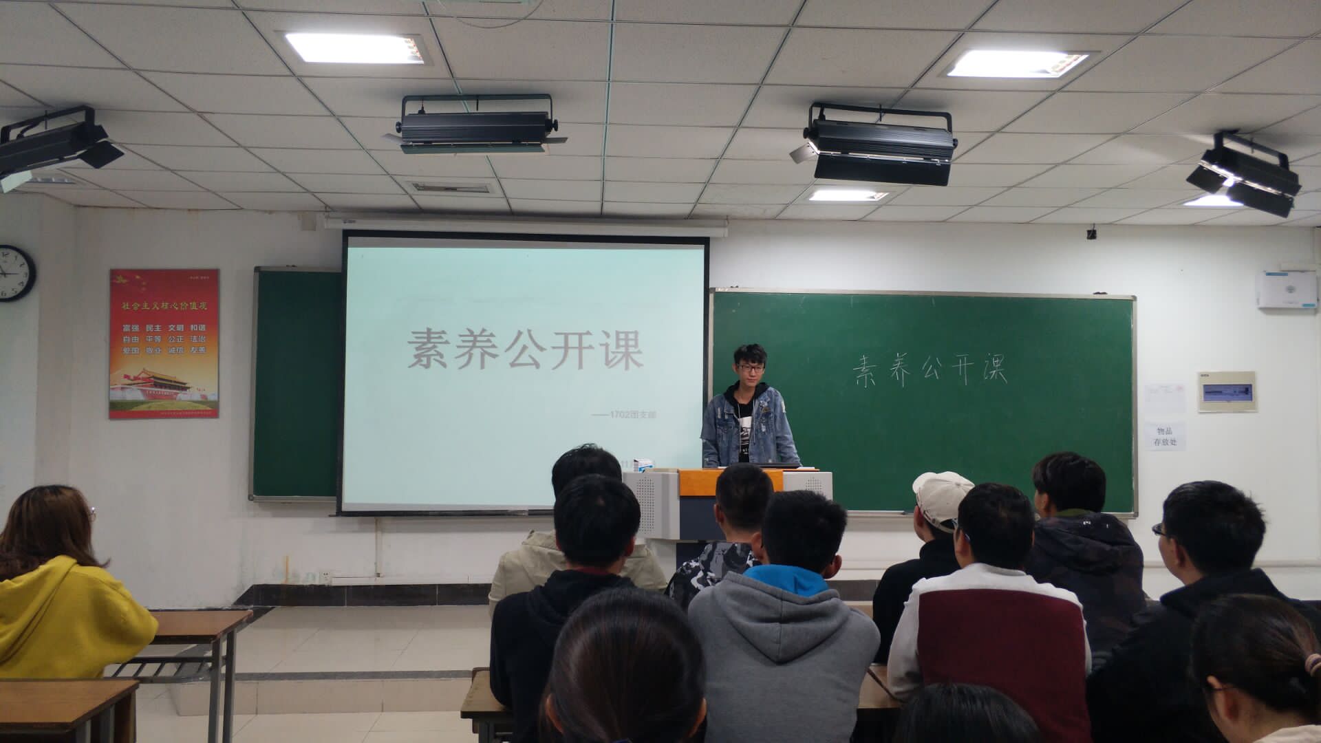 本次公开课以“如何良好建设团支部”为核心,以“如何当好学生干部”“如何提高大学生自身素养”为主题内容举行。首先,戚冉同学向同学们介绍了本次素养公开课所选择的几位代表同学,对1702班素养公开课计划开展情况做了介绍,并对未来的团支部工作表达了殷切期望。团支书周群颖引导在座同学及学生干部坚定理想信念,树立远大目标,切实做到素养的提高进步。随后,三位代表同学——校三好学生张弘毅,校优秀学生干部季东,班长孙棒棒以答辩的形式从各方面介绍了本班的建设情况,其中包括班级制度建设、班风建设、思想教育、素质拓展等。最后,各位代表与现场同学进行了互动交流,内容涉及创新学习,志愿服务等问题。