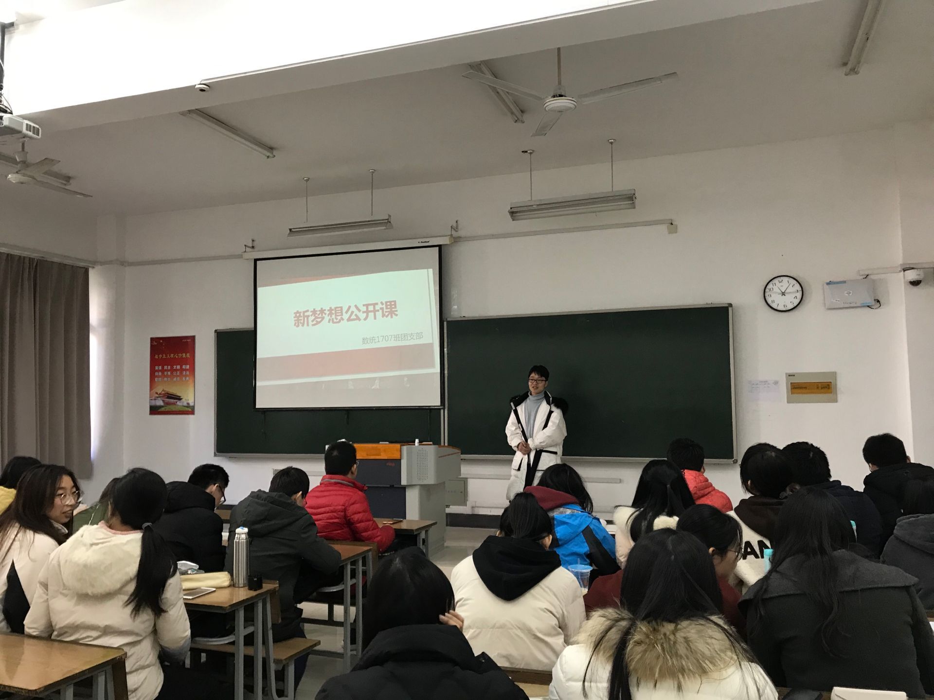 翔宇网10月29日电(记者 臧玮琪)为了让同学们深刻体会梦想在人生旅途中的重要作用,在今后的大学生活中有梦可行。新葡萄8883官网AMG1707班于10月28日在理南104开展了“新梦想公开课”活动。1707班全体同学参与此次活动。