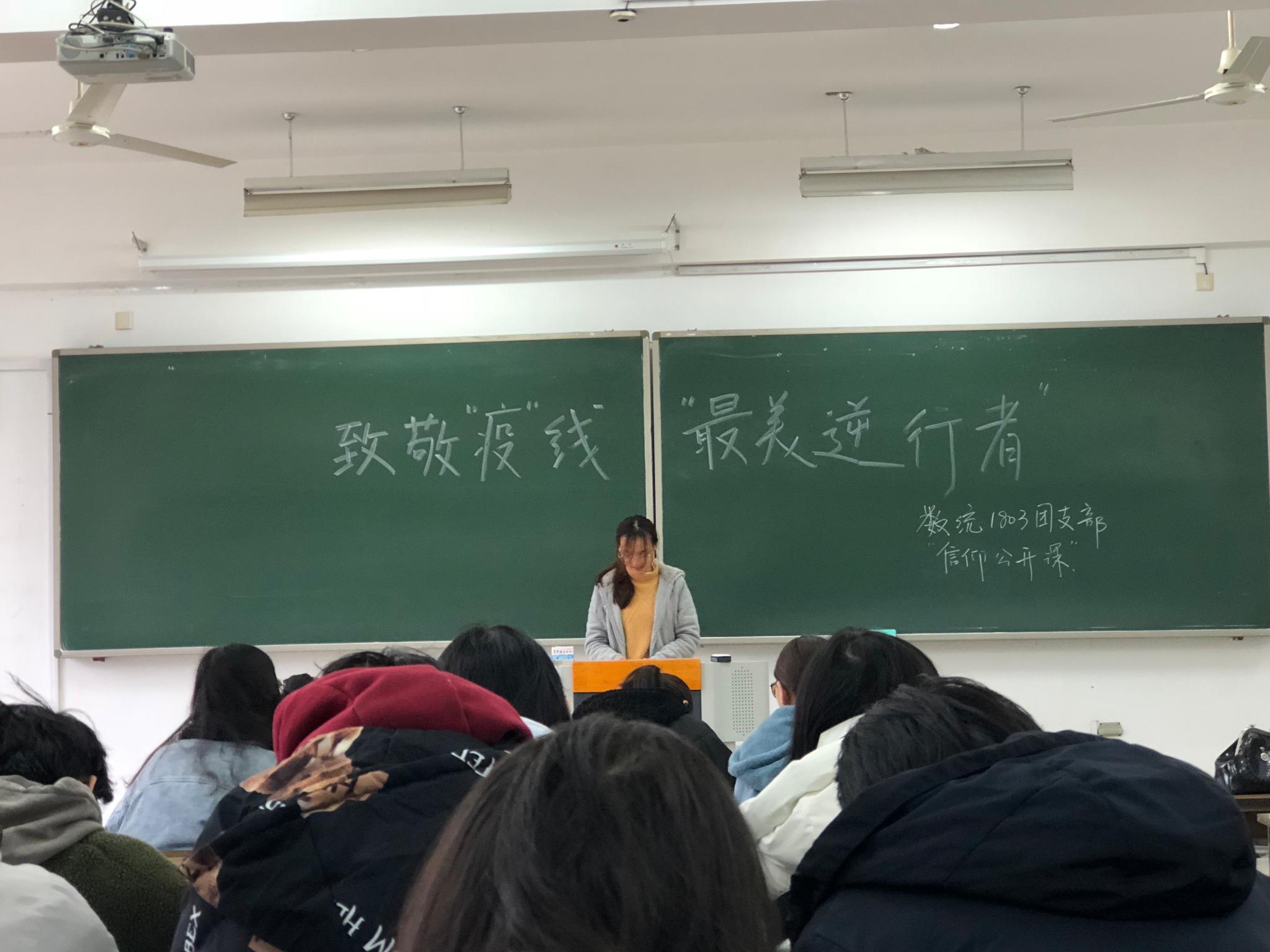 翔宇网12月3日电(记者 杨瑜)12月2日上午11点,数统1803班在理南203举办“致敬‘疫’线,最美逆行者”信仰公开课活动。活动由班级同学梁曦文主持。此次信仰公开课旨在阅读学习新冠病毒的相关知识,了解一线战疫人员的感人事迹,对一线医护人员表达真挚的感谢,增强同学们的爱国热情。