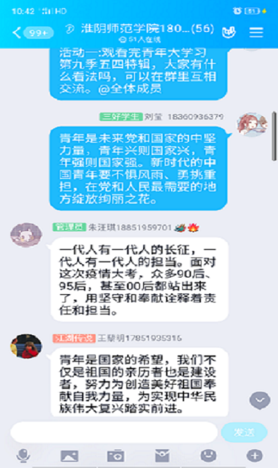 活动开始,同学们观看了此次有关五四特辑的青年大学习,看完感触颇深,同学们在班级群里分享了自己的观后感和想法,青年在接受国家良好教育和培养的同时也在体验着祖国带来的优质环境,党和国家的快速发展让新一代青年为之奋斗。活动中,全体同学在一起观看了有关疫情防控的ppt,主要讲述了在此次疫情中,社会上一些踊跃出来的青年积极抗疫的伟大事迹,他们中,有的是在校学生,有的是刚毕业的青年,都在为了抗击这次疫情团结在一起,全国人民齐心协力,为了打好这次抗疫之战贡献了自己的力量,值得我们所有人作为榜样学习。在活动最后,胡婷婷同学作为这次疫情的志愿者分享了自己的经历和感触,在疫情暴发之际,她毫无犹豫的加入了这次战疫的志愿者服务中去,展现了新青年的责任与担当,也树立了一个良好的新青年形象。