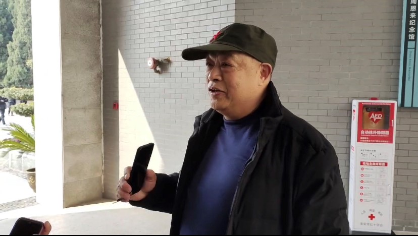 活动过程中,同学们意外遇见退伍老兵并对其进行采访。老兵对同学们提出的问题一一进行解答,他说,我们国家我们人民有这样的幸福生活来之不易,周总理做了很大的贡献,我们有这样的好总理,千载难逢!要世世代代缅怀总理的丰功伟绩,要永远缅怀周总理,再也不要把他抛弃。