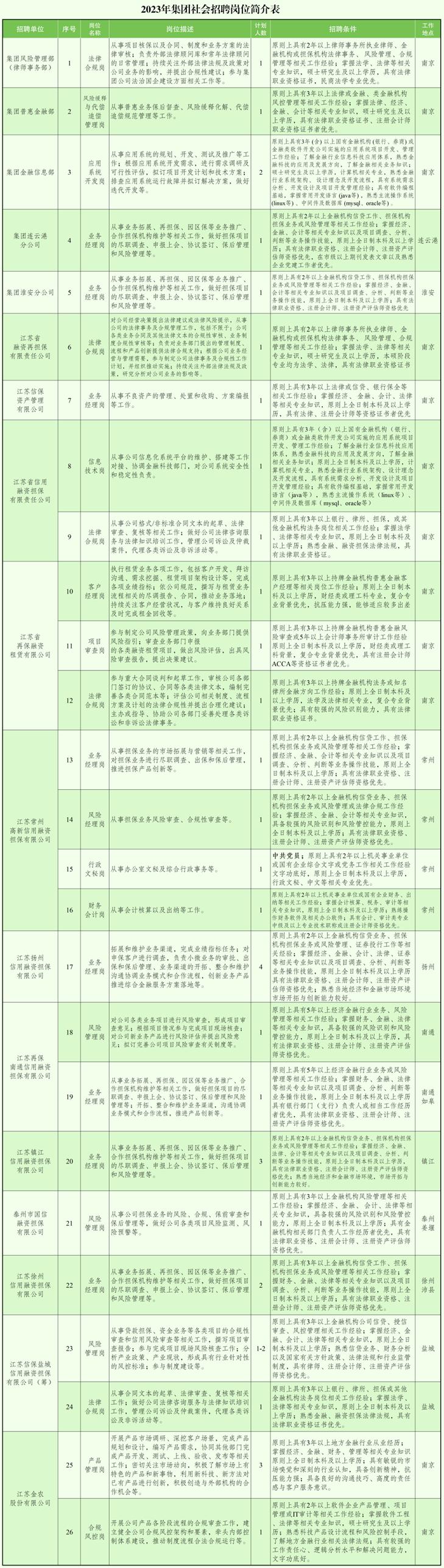 3、江苏省信用融资担保有限责任公司:信息技术岗1人、法律合规岗1人;