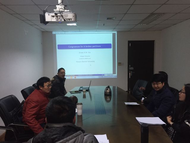 应淮师数学科学学院孙智宏、房剑平和郭军伟教授邀请,2017年12月21-24日江苏大学数学系博士生导师夏先伟副教授来数科学院讲学与交流,期间作了题为“ Congruences for broken k-diamond partithetation functions”和“Arithmetric properties for Appell-Lerch Sums”两场学术报告。报告会由数学科学学院孙智宏教授主持,基础数学系老师及博士研究生参加了报告会。