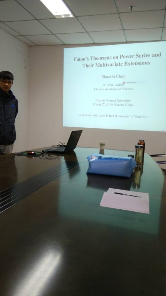 2019年3月27日上午,中科院数学与系统科学研究院,数学机械化重点实验室陈绍示副研究员(博士生导师)应邀在理工北楼301为淮阴师范学院教师作了题为《Fatou's theorems on power series and their multivariate extensions》的学术报告。数科学院院长柏传志教授主持了此次报告会。数科学院的部分教师聆听了此次报告。