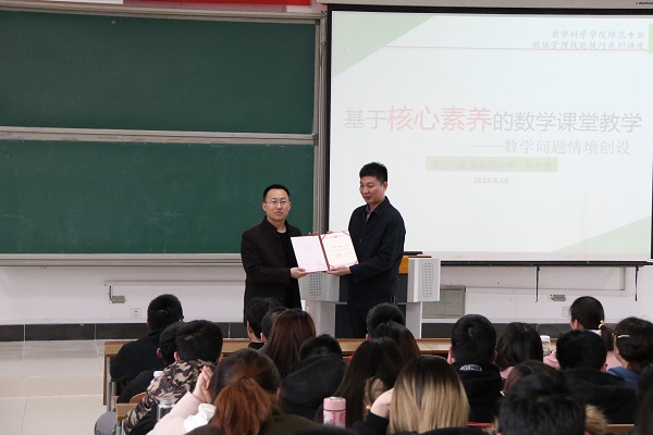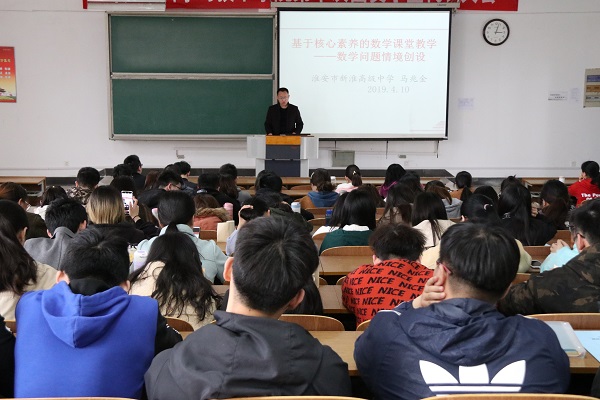 淮师新闻网4月11日电(记者 李琪琪 曹梦雅)为了让同学们更深层次地理解与运用数学问题情境创设, 2019年4月10日下午,数科学院于理工西阶201教室,召开了基于核心素养的数学课堂教学讲座,淮安市新淮高级中学的马兆金老师为此次讲座主讲人。