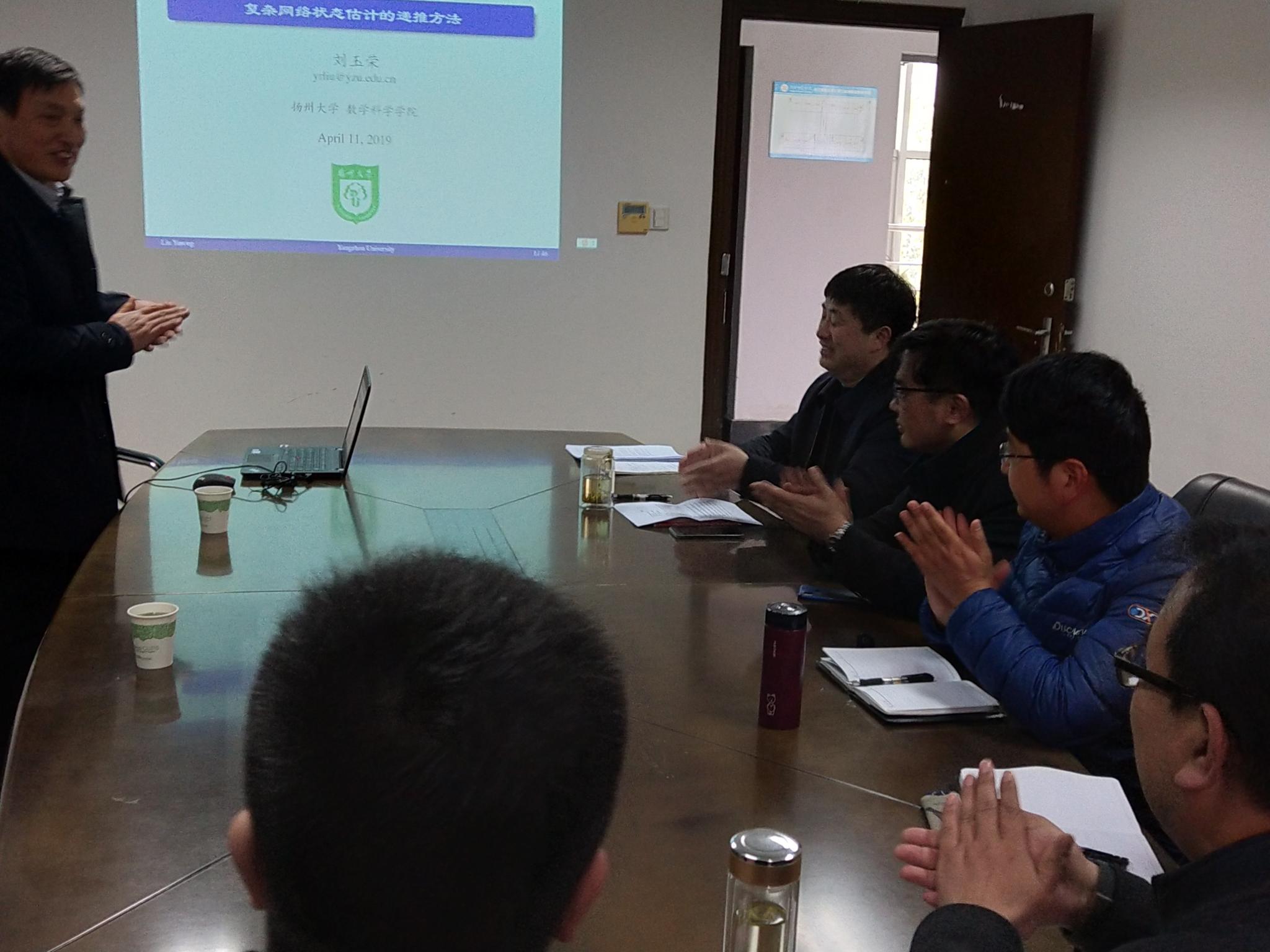 2019411日上午,扬州大学数科院博士生导师刘玉荣教授应数科院邀请,在数科院报告厅理北301室做了题为《复杂网络状态估计的递推方法》的报告,报告会由柏传志院长主持。数学重点学科组成员与研究生聆听了报告会.
