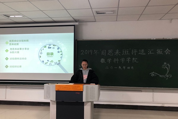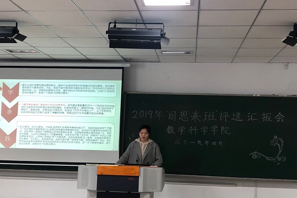 淮师新闻网4月12日电(记者 周群颖 曹梦雅)为引导学生深入学习、践行周恩来精神,推动各班在“周恩来班”创建工作中互学经验,4月10日下午,数学科学学院团委在理工南楼202教室举办了2019年“周恩来班”创建汇报会。