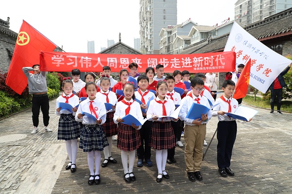 淮师新闻网4月15日电(记者 杨轲旭 王聚荃)为纪念“五四”运动一百周年,在学习感悟周恩来精神的同时,加强身为当代青年的责任感与使命感,4月14日上午,数学科学学院与淮安市青少年宫在周恩来童年读书处联合举办了快闪活动。