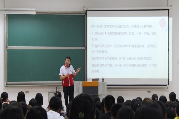 讲座主要分为三部分:现代救护新概念、紧急救护“五项技术”和在座学生现场模拟。讲座伊始,王兆军介绍了红十字运动的宗旨和使命,红十字运动旨在防止并减轻人类疾苦,保护人的生命和健康,维护人类尊严。与传统救护不同,现代救护主要立足于现场抢救。王老师结合生动形象的幻灯片,就同学们在生活中可能会遇到的突发事件及相应的急救处理措施进行讲解介绍,语言通俗易懂。接着,王老师拿出婴儿模型以示范婴幼儿气道堵塞急救方式方法,邀请在座同学体验成人气道堵塞急救过程,用人偶演示心肺复苏的操作方法,并强调现场救护的重要性。王兆军指出,急救知识理论与生活实例结合,才能为生命保驾护航。整个讲座过程气氛轻松愉悦,同学们与老师互动频繁。