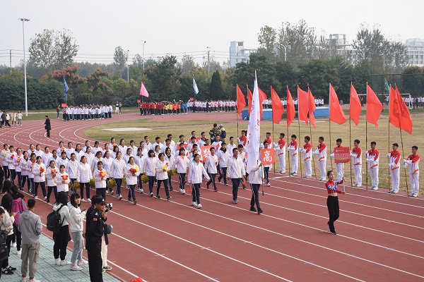 各方阵入场完毕后,国旗在慷慨激昂的国歌声中冉冉升起,全场人员面向国旗行注目礼。礼毕,焦富民致运动会开幕词。他指出,运动会是历练自我、超越自我、展示自我的舞台,需要的是追求精益求精的工匠精神;是履行团结协作的团队精神;是秉承友谊第一比赛第二的理念精神。随后,裁判员代表翟晓阳及运动员代表梁晨面向全体师生庄严宣誓。
