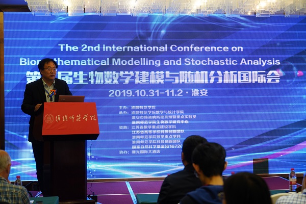 英国爱丁堡皇家学院院士、Strathclyde大学数学与统计系毛学荣教授在致辞中对于淮阴师范学院承办此次高水平国际研讨会表示感谢,并对淮师生物数学团队在传染病防控领域的成绩表示祝贺。他指出,随机动力系统被广泛用于研究种群发展动态及可持续利用以及传染病的起源、进化和传播等,充分证明随机动力系统是传染病防控强有力的工具之一。毛学荣教授勉励淮阴师范学院生物数学团队能够继续努力,争取做出更好的成果,并表示尽最大努力帮助团队建设。