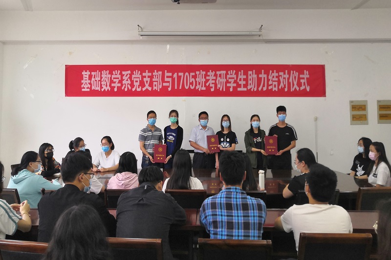 一直以来,新葡萄8883官网AMG高度重视学风建设,并将考研作为学风建设的重要抓手,着力于学生考研工作的组织体系建设、指导服务体系建设和资源保障体系建设,使学生考研管理工作走向规范化、常态化,并取得了一定的工作成效。基础数学系党支部积极服务学院中心工作,以此助力结对仪式为开端,组织支部成员结对1705班考研学生,做好学生在考研过程中的学习指导、心理帮扶等服务性工作,全方位、全程助力学生考研。