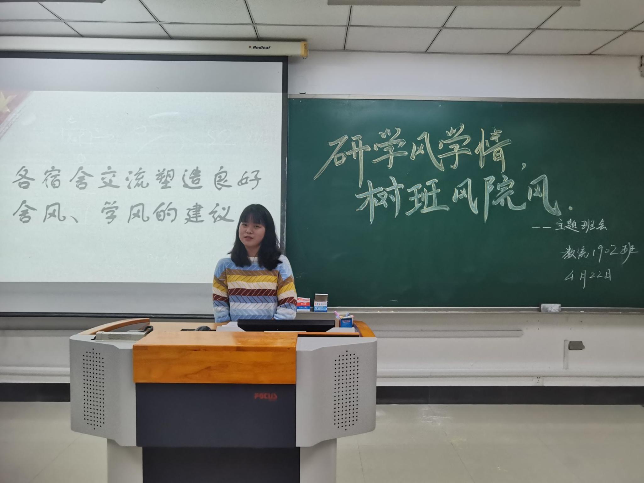 接下来,由学习委员包晴向大家分享学习心得体会,为同学们提供帮助与指导,同时也为班级良好学风的形成打下基础。随后在舍风方面,12个宿舍代表与大家交流讨论,他们表示学风建设要有集体意识,舍友间应互相督促,并阐述了良好舍风及宿舍卫生的重要性,呼吁同宿舍的同学一起制定目标,为之奋斗。活动最后,丁妍对本次主题班会提出的舍风学风班风问题进行了概括总结。