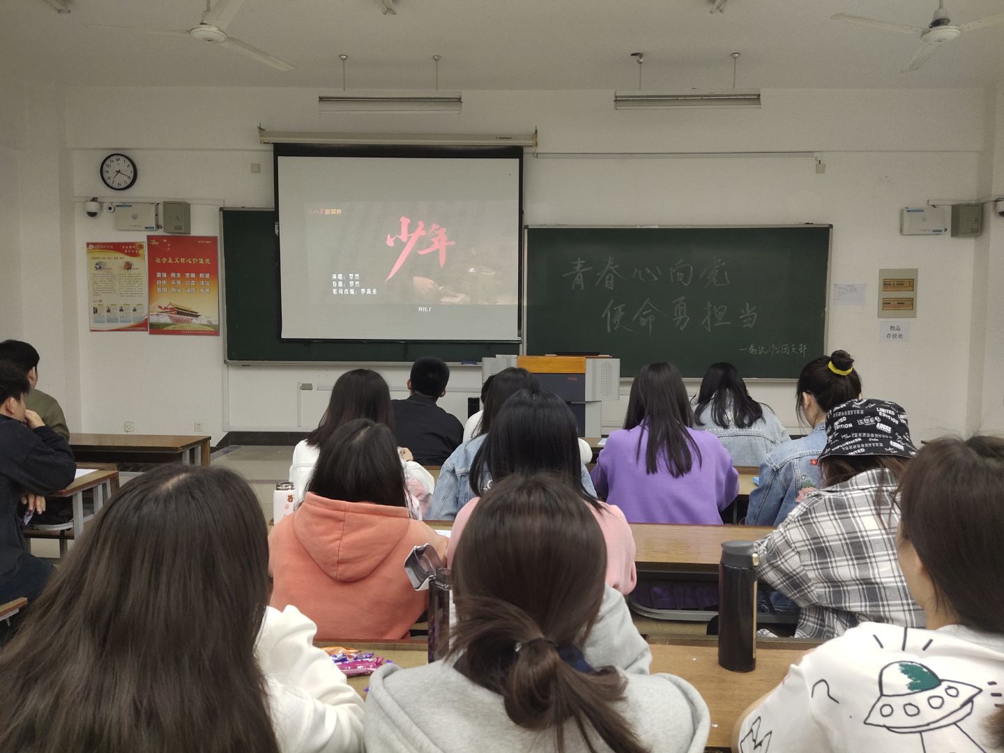 图为全班同学观看党史相关视频。记者 胡俊 摄