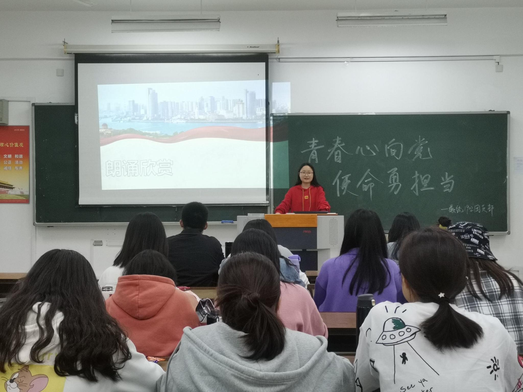 会议伊始,主持人陈潇凡宣布团日活动开始,并通过PPT向大家介绍了党史是什么 ,为什么要学党史,她用生动的语言讲述了中国共产党的光辉历程及光荣伟绩。紧接着,同学们观看了视频,通过建党过程中的历史事件,回顾了党的百年征程,并强调大家学习党史的必然性。随后由朱增等同学介绍党史时期的划分,由此突出展现了党的光辉伟绩。第三环节,罗梦蝶、陈小彤同学通过诗朗诵《红色共产党》,慷慨激昂的语调将大家带回那满是红色精神的战争时代,并将活动氛围推向高潮。