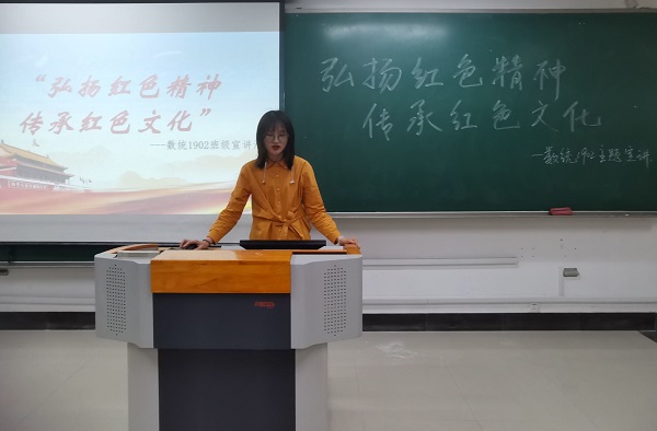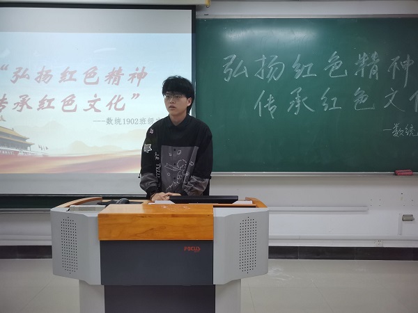 翔宇网5月12日电(记者 刘祈岑)为庆祝建党100周年,呼吁同学们学习并弘扬中国共产党的红色精神,数统1902班于5月11日在理南210开展“弘扬红色精神 传承红色文化”主题宣讲活动,活动由班长丁妍主持。