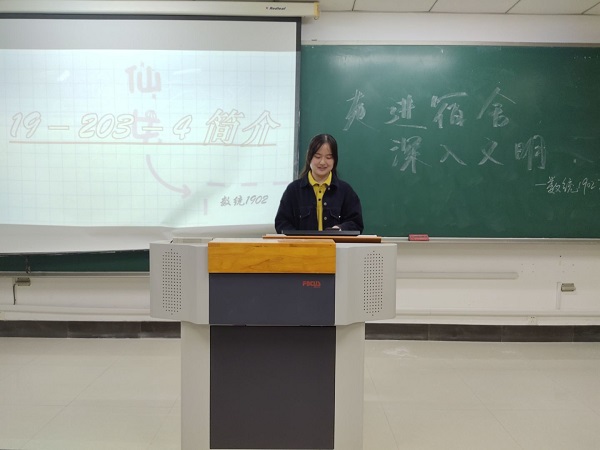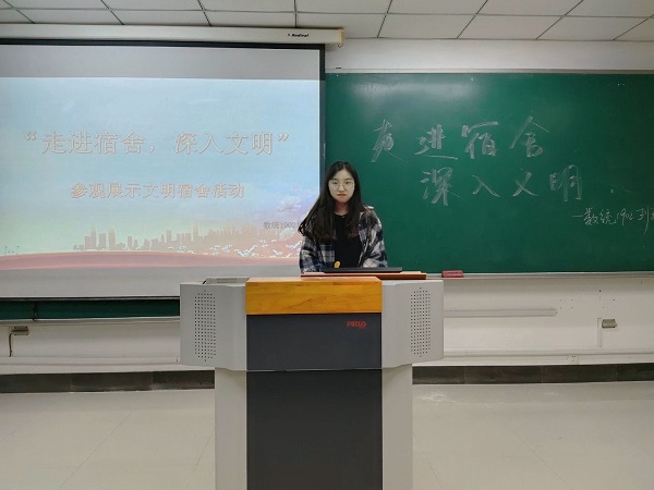 活动伊始,由连续两年获得五星级文明宿舍称号的宿舍长刘燕雯同学以PPT讲解的形式向大家展示宿舍风貌,紧接着张洲和陈小彤两位同学就展示的内容分享了对文明宿舍创建的看法及感受,他们表示,建立“文明宿舍”的长效机制可以让他们更有效地学会自我教育、自我管理以及自我服务,并且宿舍做到设施完善、通风安全和卫生清洁是很有必要的。