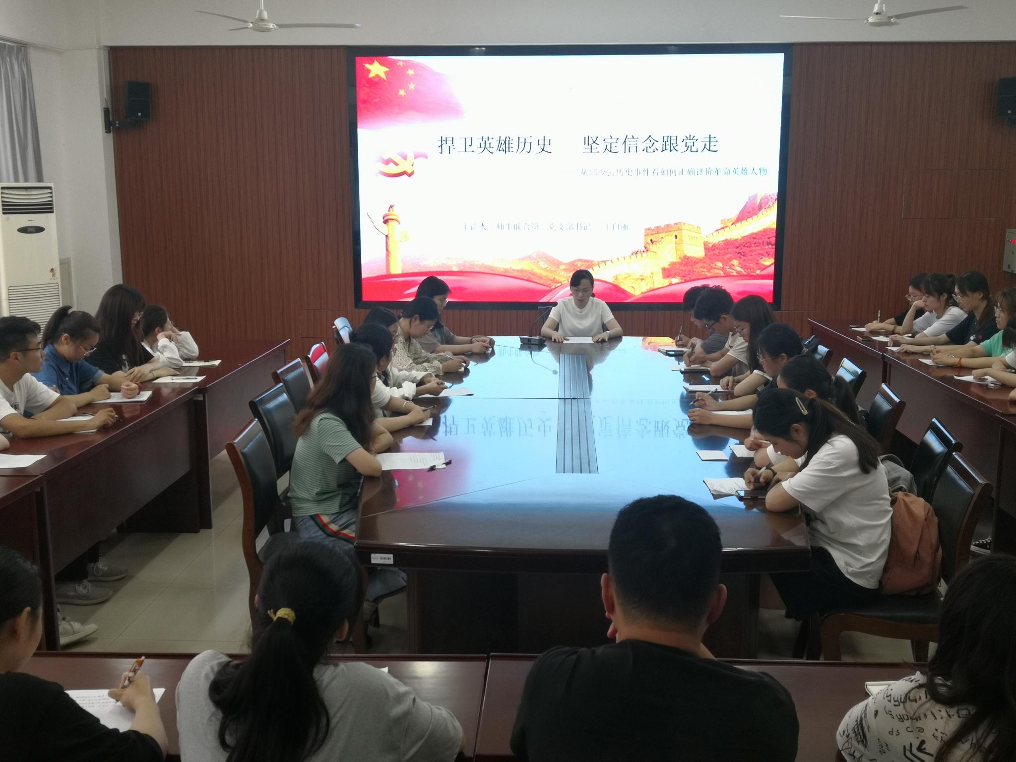 王白丽老师主要从两方面带领学生党员学习如何正确评价革命英雄人物。她强调,作为新时代中国青年,要坚决抵制历史虚无主义,捍卫英雄,了解英雄,赓续红色血脉;要树立正确的历史观,学史增信,坚定信仰,让敌对势力的不良企图破产。学生党员也纷纷就近期的党史学习、习近平总书记在庆祝建党百年大会上的重要讲话分享自己的观点与收获,并总结反思了自身不足。
