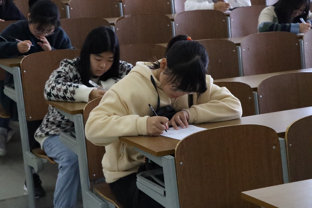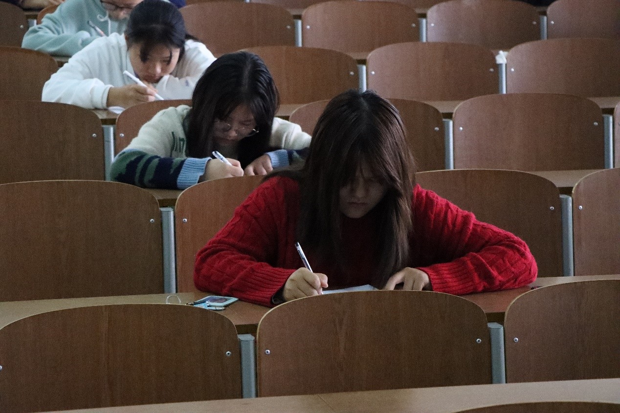 中午12时30分整,80余名同学排队进入理工楼西阶202。进入教室后,组织者安排同学们按次序,间隔坐下。同学们怀着紧张的心情,不少人仍拿着有关疫情、志愿者的相关资料在默背。按照事先的准备与安排,本次知识竞赛于12时45分整准时开始,组织者将同学们的资料、通讯设备密封放于教室正前方。由主持者清点人数,确认答卷与人数匹配,再有序分发试卷。本次试题知识点主要包括:时下疫情局势、如何有效开展保护措施以及身为志愿者应该如何开展相应活动。答题期间可以看出同学们对于本次知识竞赛的重视,同学们正全神贯注地写着试卷。教室里没有声音。只有莎莎的写字声。同学们都埋头苦干。有的咬着铅笔头思考问题,他们的笔尖在答卷上飞快的划动着,一行行答案从笔尖蹦出,没有一丝停顿,全神贯注,聚精会神,也不能形容他们的神态。有的因为想不出答案而双眉紧锁,有的为大功告成而欣喜若狂,每一位小雨露都胸有成竹。本次竞赛既是一场比赛,同时也是一次提升自己的机会。本次竞赛全面提高同学们对疫情的了解与认识。强化同学们正确防控新型冠状病毒的意识、观念及行为,有利于促进志愿活动的开展。加强对同学们疫情防控知识的科普及思想引领,提高自身素质和品格。答题结束,组织者们按序收齐试卷,有的同学脸上充满自信,有的同学显示有些失落,虽然每一个的成绩都不一样,但是这一次竞赛对于他们而言,每一个人都取得了同样的经验。