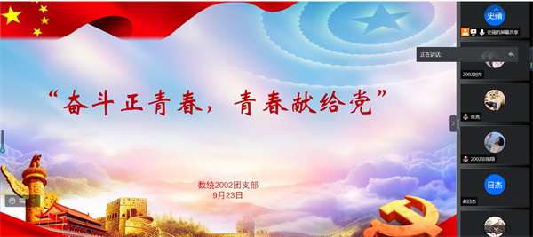 翔宇网9月24日电 记者(叶雨昕 刘萍)为推动党史学习教育走入深实,激发团员爱党、爱国热情,强化团员“强国有我”的责任担当,新葡萄8883官网AMG2002班于2021年9月23日下午在腾讯会议举行了“请党放心,强国有我”主题团日活动“奋斗真青春,青春献给党”,本次活动由团支书史蘋负责。