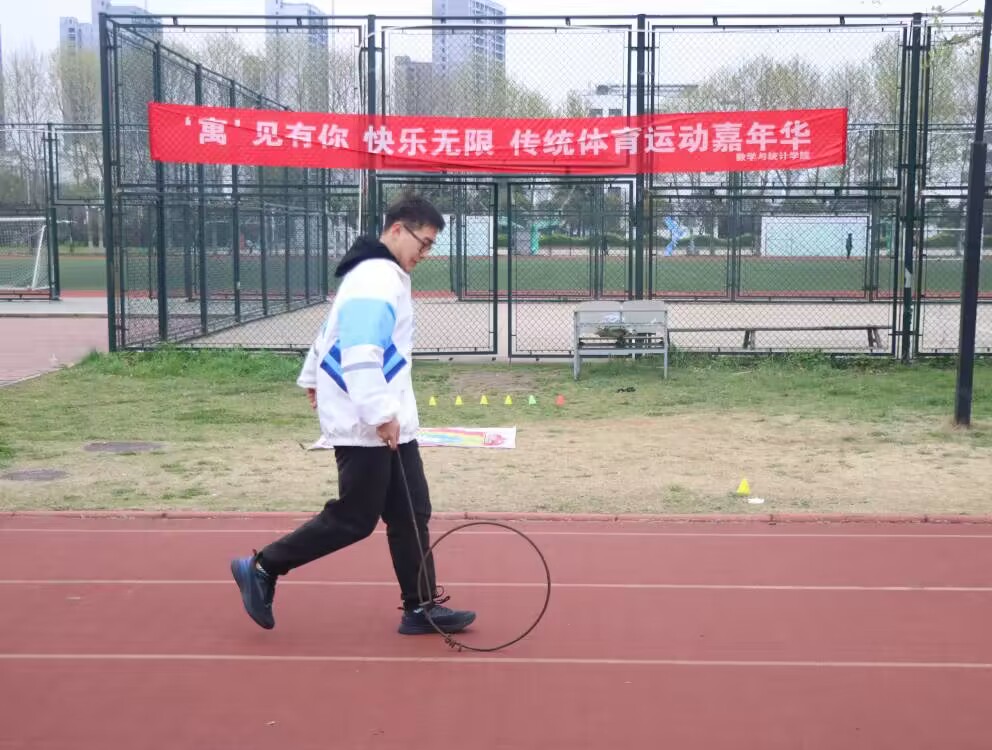 滚铁环是技术难度最高的一个项目。调皮的铁环满场地跑,参赛者手中的铁钩却是略显慌乱。原本紧张的参赛现场也因此多了分乐趣。但依旧不乏高手,上钩,一推,铁环与地面垂直,在推力的作用下向前走,最后将它交给舍友,一直滚下两个回合,才算结束。