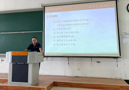 最后,实习带队米振昌老师围绕教育实习的内容与要求、实习过程常见的问题两个方面为同学们做了详细的解释与说明。他提出,一是在课前要认真钻研《课程标准和教材》,了解数学学科的教材体系和熟悉教材的基本内容,上课前要反复进行磨合;二是在实习的过程当中要虚心的向指导老师学习上课的一些基本素养,管理学生的技巧;三是要端正实习态度,在实习过程中要保持谦虚谨慎的态度,能正确处理好与指导老师以及所带班级学生的关系,希望同学们能够在实习期间积极适应实习单位的工作氛围。