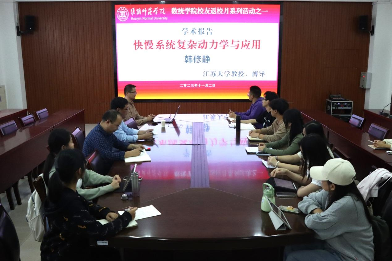 11月2日下午,学院邀请2000级优秀校友、江苏大学教授、博士生导师韩修静为在校师生作《快慢系统复杂动力学与应用》的学术报告。该报告介绍了所在课题组提出的快慢分析的新方法、新概念,阐述了频率转换、转换相图等概念,并通过列举应用快慢分析进行研究并解决相应问题,验证了快慢分析的可行性。韩修静教授与学院师生进行了交流,他表示回到母校深感亲切,希望能够通过本次报告为新葡萄8883官网AMG在学术交流、人才培养、项目合作和师资引进等方面贡献力量,助力母校发展。