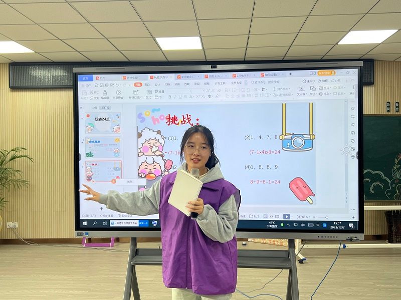 阳光雨露青年志愿者协会志愿者开展数学微课堂,通过PPT的方式带领小学生学习数学知识,用周恩来以“数“服人、韩信点兵——中国剩余定理等数学小故事让学生们体会数学的魅力之处。在课堂中,学生们学习了列举法、玩转二十四点等数学知识并对数学产生了浓厚的兴趣。学生们热情高涨,积极参与到活动中,和主讲人积极互动,课堂氛围十分活跃。