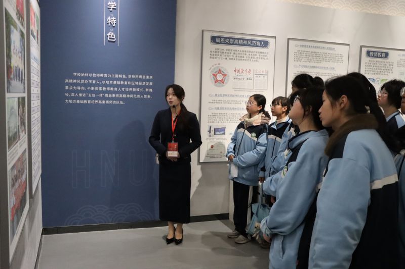 理工楼,讲解员以深情的讲解带领钱集中学的学生们开展“周总理我想对您说”活动。学生们在明信片上写下对周总理的敬仰与感激之情,深入感受总理精神的伟大与崇高。从青年求学时“为中华之崛起而读书”的壮志,到五四运动、红军长征、万隆会议、尼克松访华等丰功伟绩,总理的伟大贡献和崇高精神一一展现。学生们明白"相会于中华腾飞世界时"是理想,是征程,是事实。